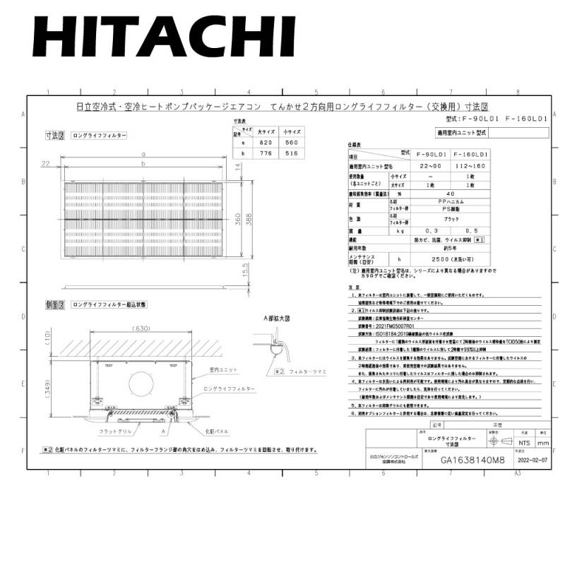 【】日立 F-160L1 (天カセ 4方向 RCI-AP/RCI-GP28K~160K用) : ロングライフフィルター 昇降用 防カビ交換用∴