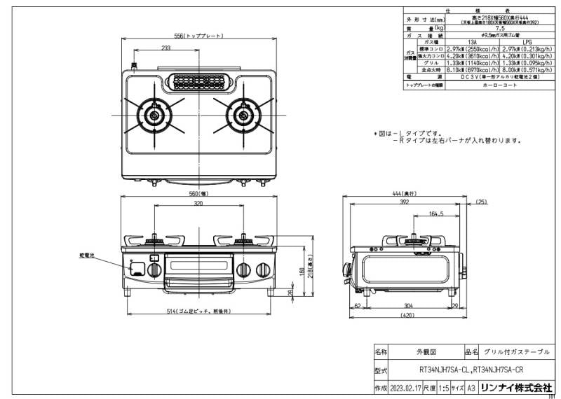 【】リンナイ RT34NJH7SA-CR LPG (51-7523) : テーブルコンロ 2口グリル付き 56cm片面 ∴